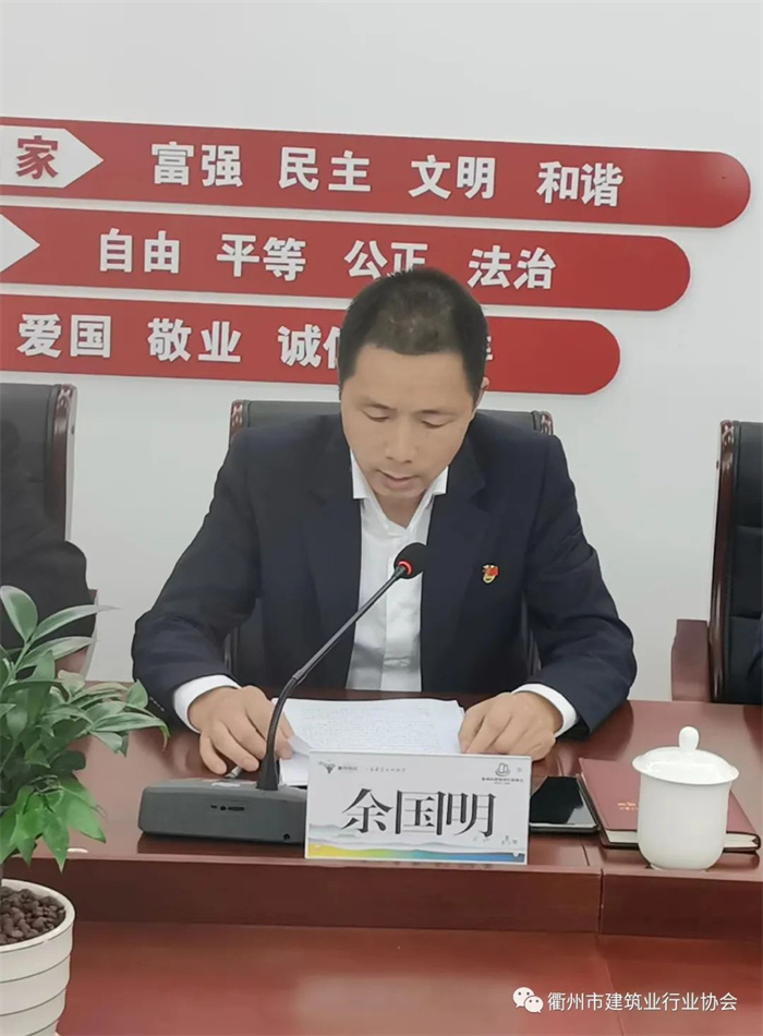 协会顾问吕晓萍向大会汇报了市建协第七届会员大会换届选举的具体情况及结果,介绍换届后新的组织架构、秘书处各部门的工作职责以及《衢州市建筑业行业协会民主选举制度》、《衢州市建筑业行业协会会员大会制度》、《衢州市建筑业行业协会理事会制度》、《衢州市建筑业行业协会监事制度》、《衢州市建筑业行业协会财务管理制度》、《衢州市建筑业行业协会法定代表人述职制度》、《衢州市建筑业行业协会分支机构管理制度》、《衢州市建筑业行业协会信息披露制度》、《衢州市建筑业行业协会重大活动备案报告制度》、《衢州市建筑业行业协会党建党风廉政建设制度》、《衢州市建筑业行业协会内部管理制度》等11项管理制度。